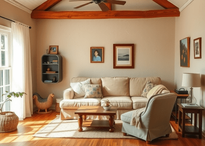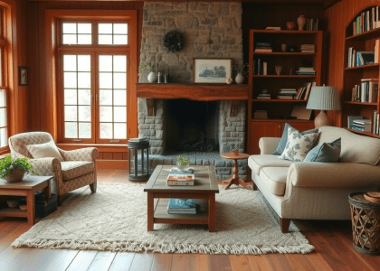 Cozy farmhouse living room featuring beige walls, a plush sofa with patterned cushions, handwoven rugs on polished wooden floors, a crackling fireplace, and shelves filled with family photographs and knick-knacks, offering cozy ideas and inspiring decor for your home at triplecrownsalon.com. This inviting farmhouse living room captures the essence of comfort with its warm beige walls and a well-loved sofa adorned with patterned cushions. Handwoven rugs bring vibrancy to the polished wooden floor, while a stone fireplace adds a cozy touch. Personalize your space with family photographs and treasured knick-knacks to create a warm, welcoming atmosphere that tells your unique story. 🛋️🔥📚